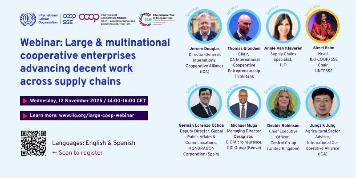 As part of the 2025 UN International Year of Cooperatives (IYC2025), the ILO Cooperative and SSE Unit and ICETT will host a webinar on 12 November 2025, highlighting how large and multinational cooperatives are advancing decent work across supply chains. The event will shed light on how these enterprises integrate cooperative principles into responsible purchasing, labor rights, and inclusive business practices globally.