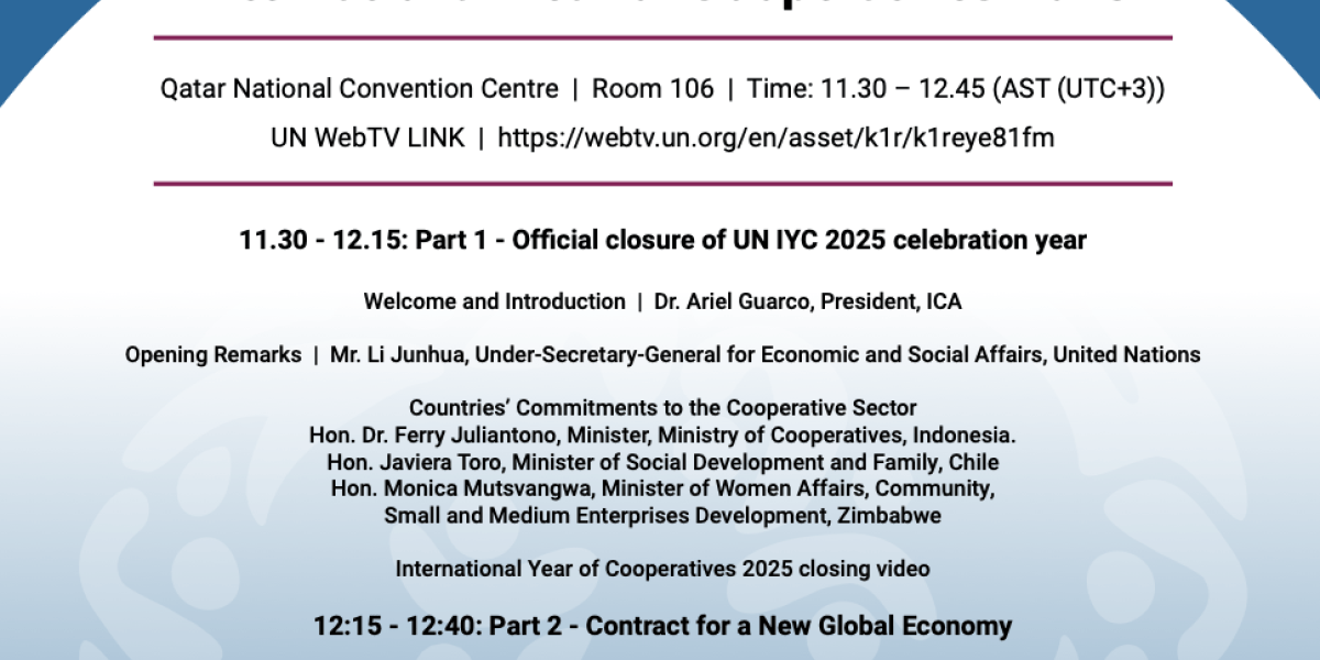IYC2025 Closing Ceremony programme (Doha, 4 November 2025) 31 Oct 2025 Type: Official meeting documentation Files: iyc_closing_programme_1.pdf (200.42 KB) Share this publication Facebook share Tacebook share Google Plus share Linkedin share Share by email LATEST COOPERATIVE NEWS 11 Dec 2025 Competitiveness and social responsibility are not opposing goalsGiuseppe Guerini and Jeroen Douglas Highlight… 11 Dec 2025 ILO-ICA Report: Cooperatives as a “limited-profit” modelIn response to a number of national… 11 Dec 2025 Global Cooperation Spotlight: 2026 Edition of Co-operative Law Summer School AnnouncedThe International Cooperative Alliance in… 11 Dec 2025 Case studies: addressing the causes of povertyIn his … More news